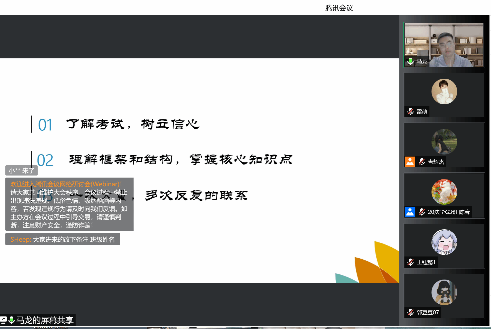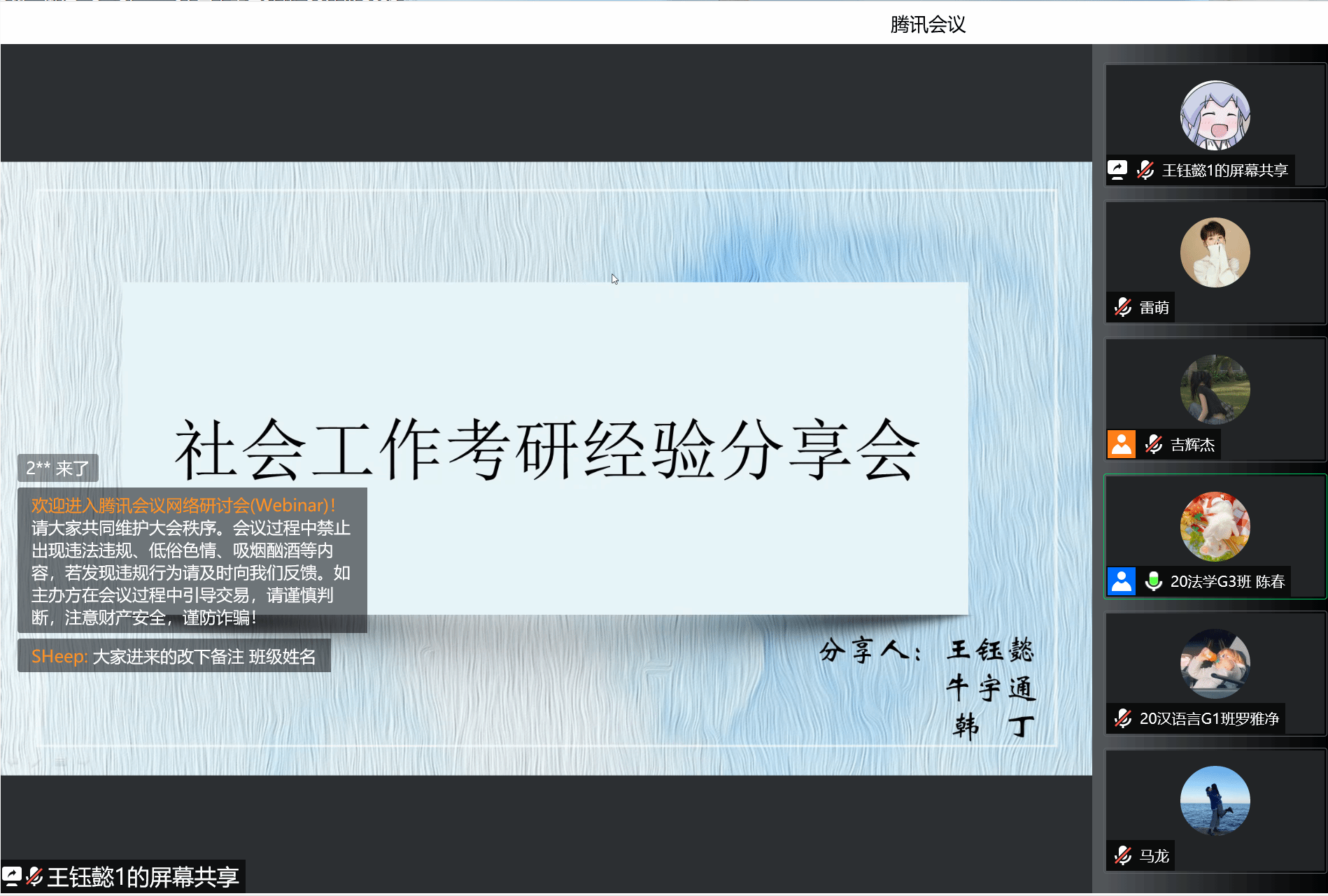助理社会工作师经验交流由卫瑞璠和马龙两位同学主讲。他们分别分享了助理社会工作师备考以及取得资格证的经验,从为什么考、如何报考、报考条件、怎么考取和如何复习等五大方面进行了讲解。卫瑞璠同学重点讲述了报考难度,不能因为助理社会工作师难度低而掉以轻心。之后马龙同学讲解备考复习,他提到要先了解考试,然后去理解框架结构,掌握重点,再进行巩固练习。最后,五位同学就参会同学提出的各类问题进行答疑,高瑞红老师做最后总结。