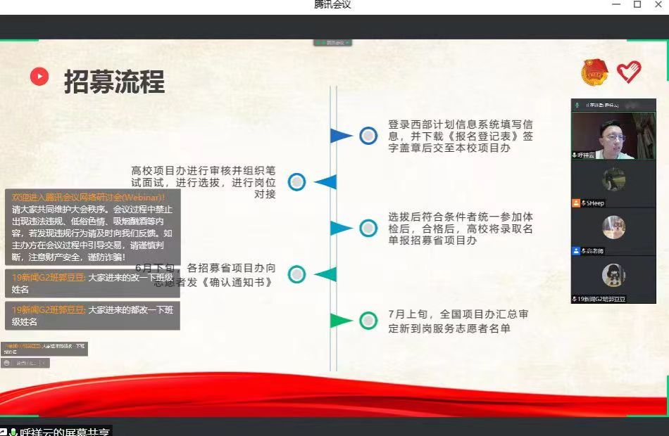 活动在高瑞红老师的介绍中拉开序幕。之后呼祥云同学分享服务西部计划的心得体会。他讲述了自己志愿服务西部计划的初心,并通过播放大学生志愿服务西部计划的宣传视频,帮助大家进一步了解该项目,激励大家志愿服务西部计划的热情。随后,呼祥云同学为大家分享了西部计划的报名流程、政策支持、工作补贴和自己的西部之旅。同时,他从是什么、怎么做、到怎么样等多方面更深一步地进行了补充,讲述了自己服务西部的目的以及意义。他表示参加西部计划不只是领略祖国的广袤无垠,更重要的是服务基层,服务百姓,为国家建设添砖加瓦。呼祥云同学还积极鼓励同学们投身奉献西部计划,在实践中增长才干、书写无悔青春。最后,呼祥云同学就同学们提出的各类问题进行详细解答,会议在高瑞红老师的总结后圆满结束。