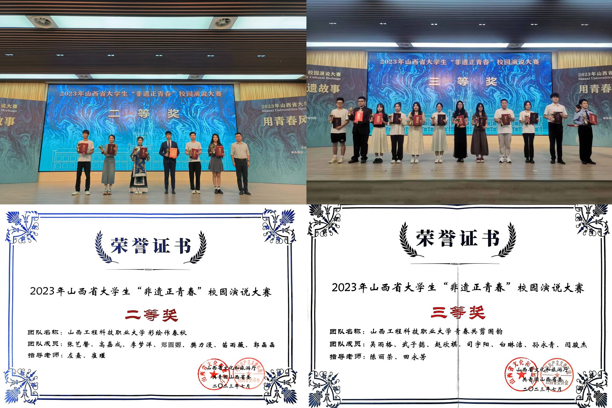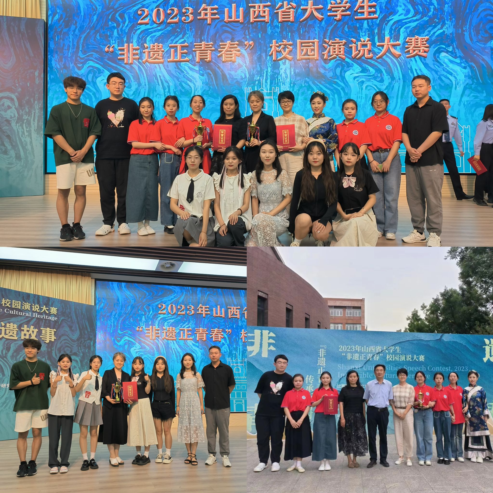 非遗千古传,文泽天地间。为贯彻落实党的二十大精神和习近平总书记关于非物质文化遗产保护工作的重要指示精神,促进同学们对非物质文化遗产的保护传承意识,丰富大学生心理世界、提高自身素养。在校团委大力支持下,学院领导的正确带领和学院团委精心组织下,我院陈丽荣、田永芳、左熹、崔瑾四位老师分别带领两支学生参赛队伍于2023年7月1日、2日在山西大学参加了由山西省文化和旅游厅、共青团山西省委共同举办的2023年山西省大学生“非遗正青春”校园演说大赛。