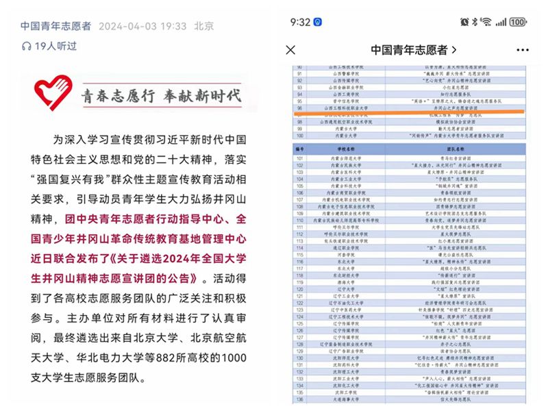 为深入学习贯彻习近平新时代中国特色社会主义思想和党的二十大精神,落实“强国复兴有我”群众性主题宣传教育活动相关要求,引导动员青年学生大力弘扬井冈山精神,团中央青年志愿者行动指导中心、全国青少年井冈山革命传统教育基地管理中心近日联合发布了《关于遴选2024年全国大学生井冈山精神志愿宣讲团的公告》,活动得到了各高校志愿服务团队的广泛关注和积极参与。通过前期充分准备与积极申报,我院“井冈山之声”志愿宣讲团成功入选。