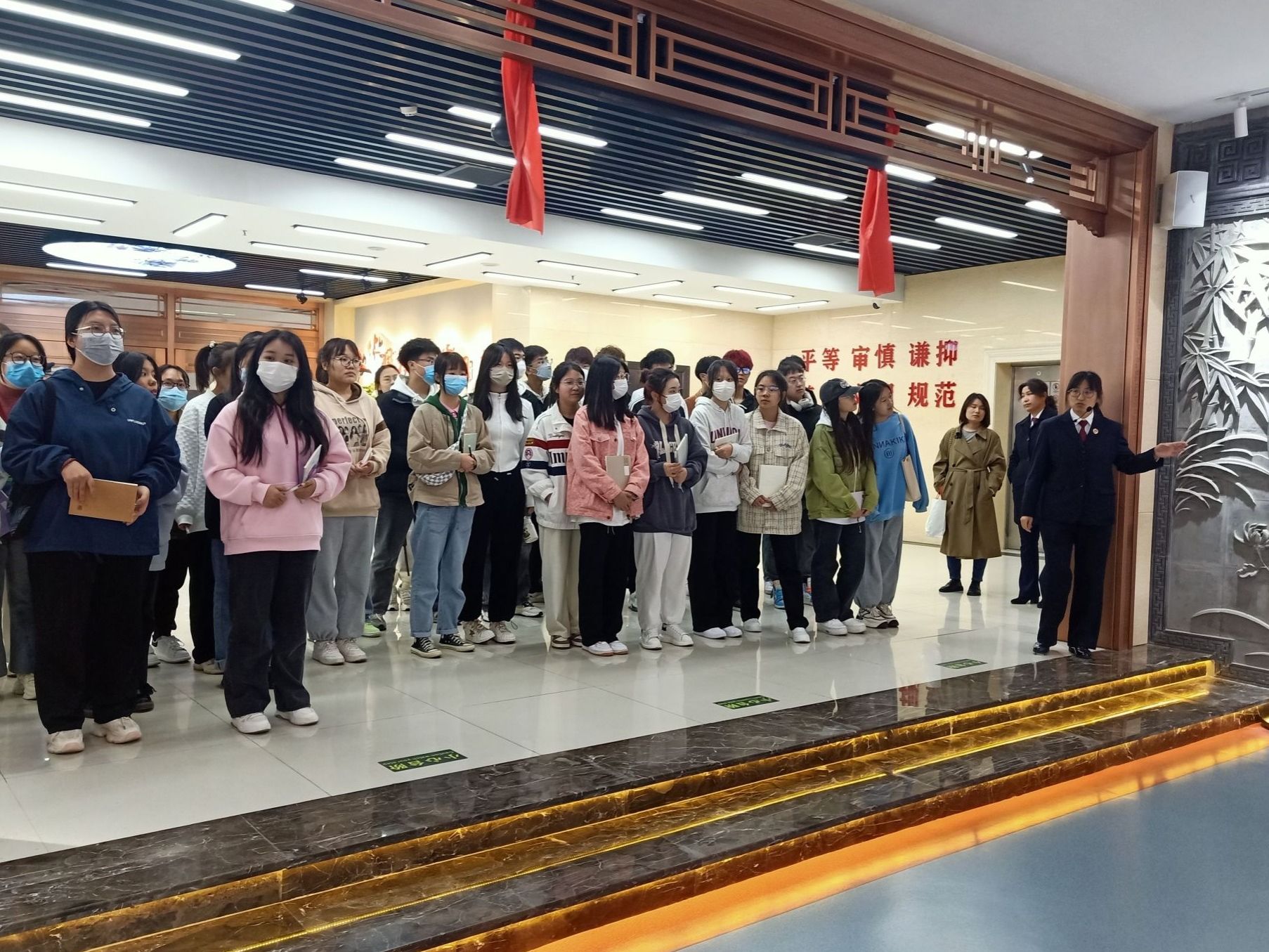 活动中,同学们怀着对检察院的好奇,在检察院工作人员的引领下,同学们集体观看了晋中未检宣传片《未你而来,检爱同行》,参观了晋中检察文化陈列馆、清廉检察文化馆以及青少年法治教育基地,实地了解检察文化内涵和未成年人检察工作职能。工作人员向同学们介绍了晋中市检察院的工作宗旨、历史渊源以及很多山西历史上著名的与检察工作相关的人物,在感受晋中检察院历史的同时也感受到了山西文化的魅力。鲜明的图片,详实的文字和细致的解说,让每一位同学都深受触动。当走到玻璃展柜前,里面陈列着一套套检察院的工作服,“棱角分明”的摆放在那里,同学们不由得心生敬畏,体会到了这项工作的庄严性。