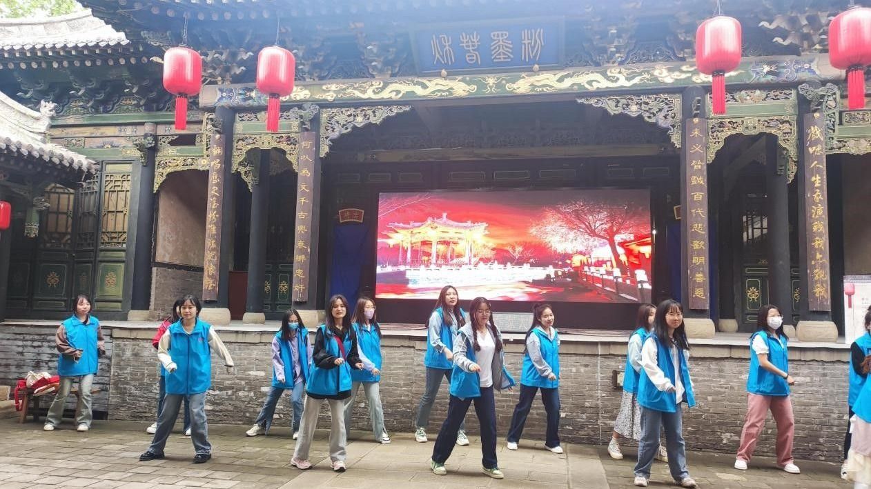 在活动过程中,志愿者们身穿蓝色志愿者马甲,在乔家大院的牌楼、照壁、花园、戏台等多个地方进行了“快闪”舞蹈、歌曲演唱、独舞表演以及诗朗诵等活动。他们用实际行动传递出了热情,一抹抹身影成为乔家大院中一道亮丽的风景线。尽管在活动后期,天气逐渐转阴,但丝毫不影响同学们的热情,跳舞力度不减,唱歌满怀感情,带动着台下的观众们一起舞动了起来,同学们对志愿活动的认真与积极永远留在每个游客的心中。正因为同学们坚持以最饱满的状态面对一切状况,此次“五一节志愿服务”活动顺利收官。