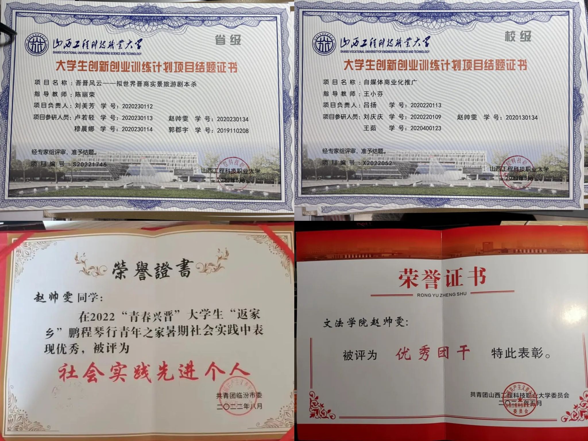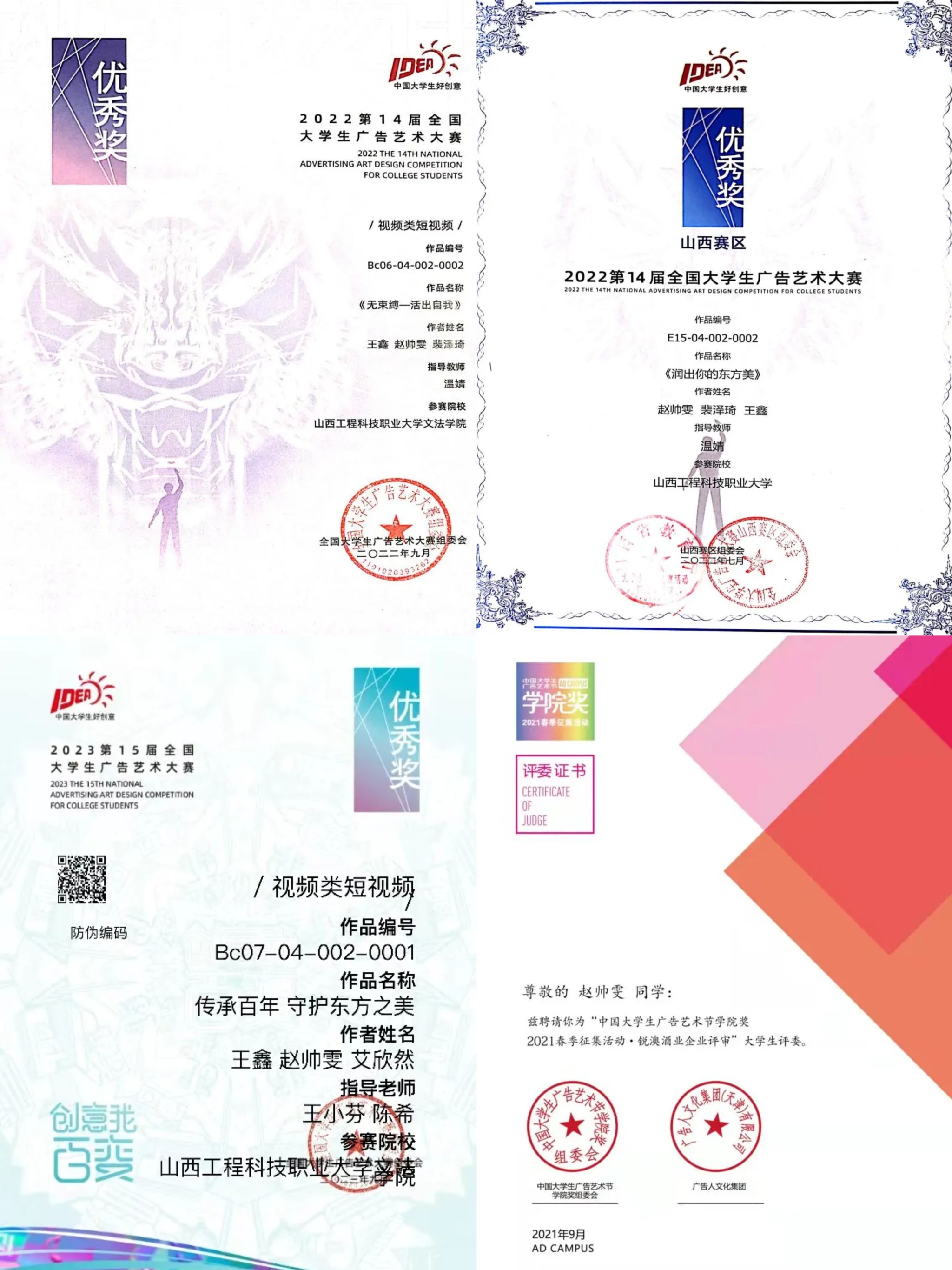 三、硕果累累。在校期间,她累计荣获20余项奖项。其中,大学生创新创业项目获得2022山西省省级立项、第三届“互联网+”铜奖等;创新创业训练项目省级、校级2项结题。先后获得第15届和第14届全国大学生广告艺术大赛2个国家级优秀奖、2个省级三等奖、3个省级优秀奖;获得共青团临汾市委“喜迎二十大、奋进新征程、永远跟党走”主题朗诵比赛市级一等奖;获得校级啦啦操比赛团体二等奖等。此外, 大学期间曾获得校级“三好学生”、“优秀学生干部”、“优秀团干”、“新生军训优秀个人”、“青春兴晋”大学生“返家乡”暑期社会实践“先进个人”等称号,还获得2022“青春兴晋”大学生鹏程琴行青年之家暑期社会实践“先进个人”、“中国大学生广告艺术节学院奖2021春季征集活动·锐澳酒业企业评审”优秀大学生评委等称号,共计10项荣誉称号。