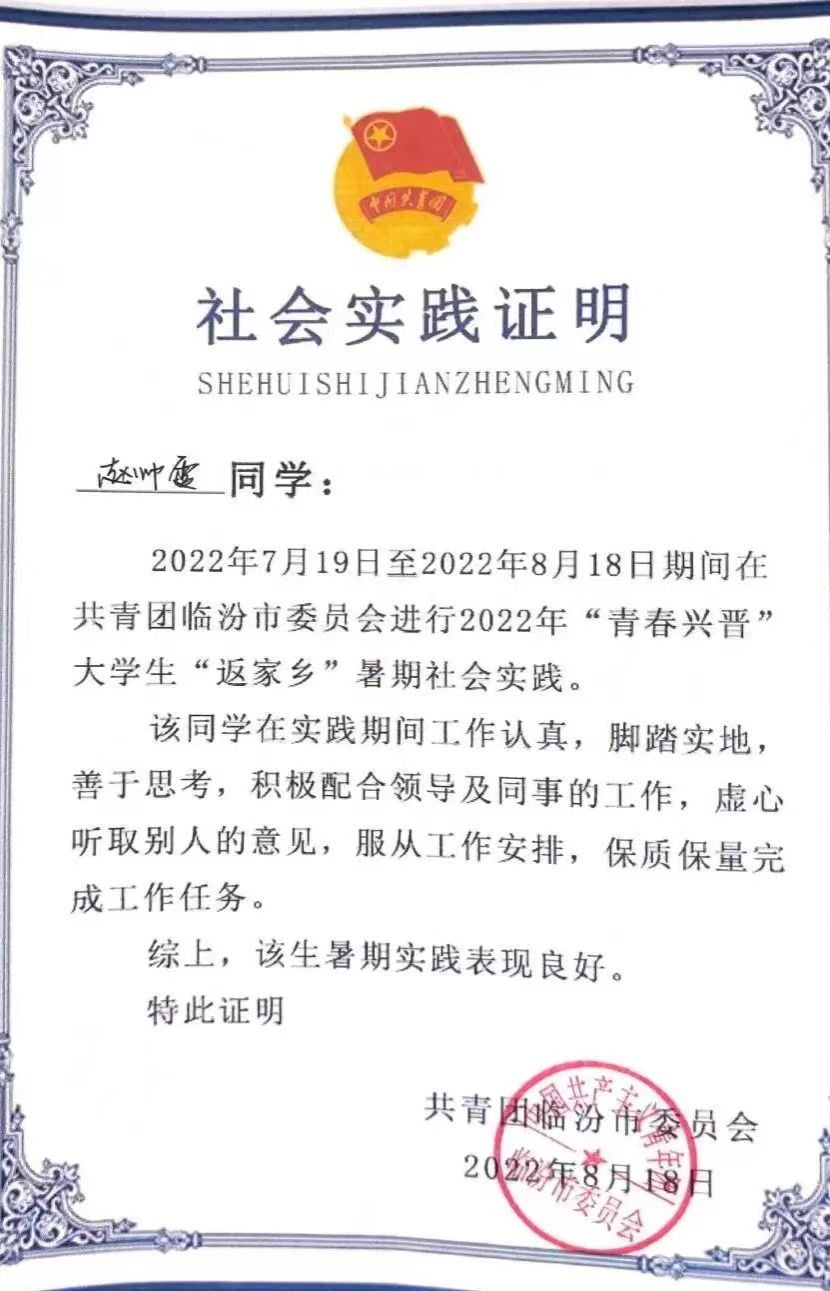 四、行以致远。知是行之始,行是知之成。在社会实践志愿服务方面,她积极以党员的责任担当服务社会,投身于家乡建设和“我为师生办实事”中,参与志愿服务项目10余项,志愿服务时长累计820.31小时。个人参与志愿服务工作事迹曾被临汾日报、临汾新闻网以及山西共青团等组织的媒体平台进行宣传报道。其中,在临汾日报“创文明城市宣传片”中,作为大学生代表进行发言,对创造文明城市,发挥大学生青春力量进行号召。此外,在步入大学前,她在火锅店做过服务员、在超市做过促销员。大学暑假期间,在甜品店做过饮品员、烘培员等等,这些经历让她深知劳动的不易。她也在摄影工作室进行过专业实践,在疫情期间积极参加家乡当地疫情志愿服务工作,参加“青春兴晋”大学生“返家乡”实践活动等。在“青春兴晋”大学生“返家乡”实践活动中,她多次参与了当地团委组织的各项活动,例如:寻访、研学、青年之家汇演等,并撰写了调研报告。在校期间,积极参与校园搬迁志愿服务、疫情期间送餐志愿服务、迎新志愿服务、2022普通话考试志愿服务等诸多志愿工作,以实际行动践行党员使命、青年担当、青春风采。