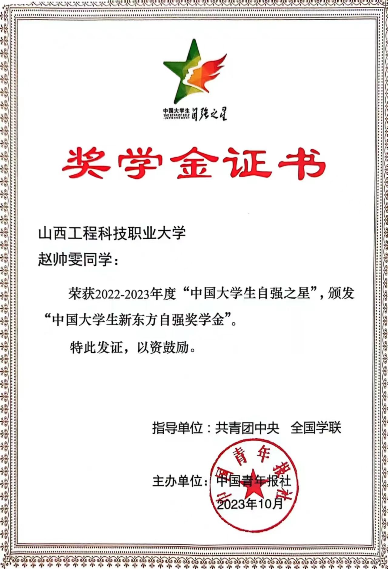 经各高校推荐、省级初评、全国评审等环节,我院20广告G1班赵帅雯同学荣获2022——2023年度“中国大学生自强之星”荣誉称号。