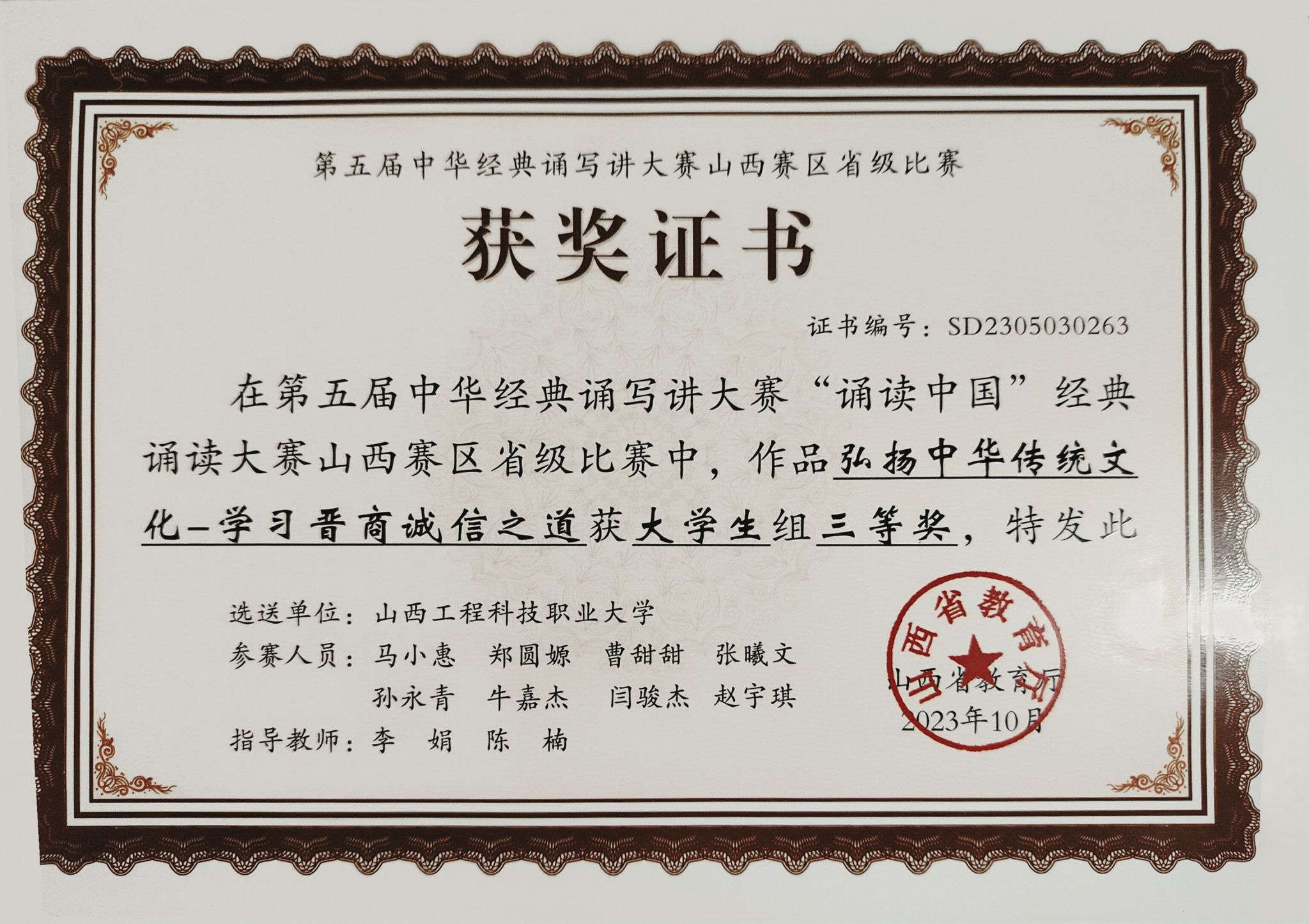 最终,我院选送的作品《弘扬中华传统文化 学习晋商诚信之道》荣获“诵读中国”经典诵读大赛大学生组省级三等奖。作品将晋商文化精神“诚信”和经典诵读篇目相结合,采用群体朗诵和情景演绎的形式进行了诵读展示。