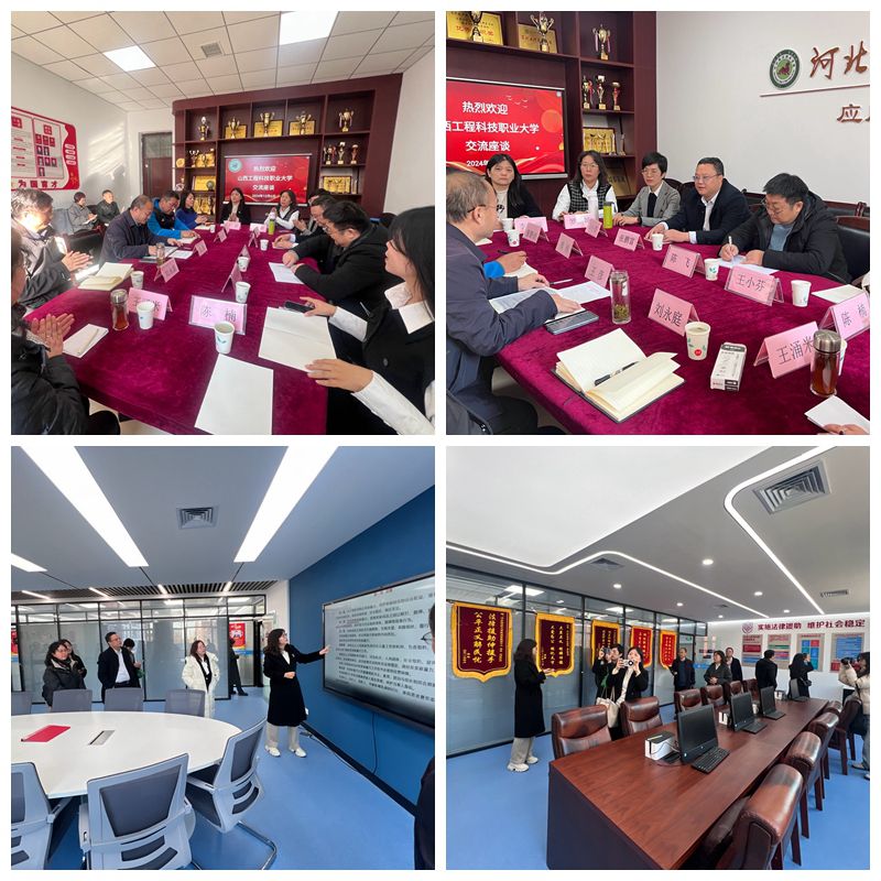 在交流过程中,听取了河北政法职业学院领导对党务工作、学生管理、专业建设、人培方案制订、学生实习、“法律+”人才培养模式等情况介绍。双方就法律专业的产学研、岗课赛证、电子教材、“法律+”课程的融合等进行深入交流。实地参观了河北政法职业学院在教学设施与实训基地、实践教学实训室、校内实训课开展、实践教学成果、校企、校地合作等建设成果。特别是依托实训室建设推动职业法律和网络新闻传播专业教育教学融合发展,通过司法机关、企业联合办学模式,建设了数字化模拟法庭、云诉讼、法律援助中心等实训基地,建设了法律职业联盟、学生法律文创产品、法律服务云智平台等,建设了“政法名师说、法制流动课堂、法治志愿服务、AI尚法·法律服务、尚法双侠”五大普法品牌,实现了教学与实践,学生培养与社会需求同向发力,探索出了一条培养高素质法律职业者的路径,高质量的服务地方经济社会的发展。