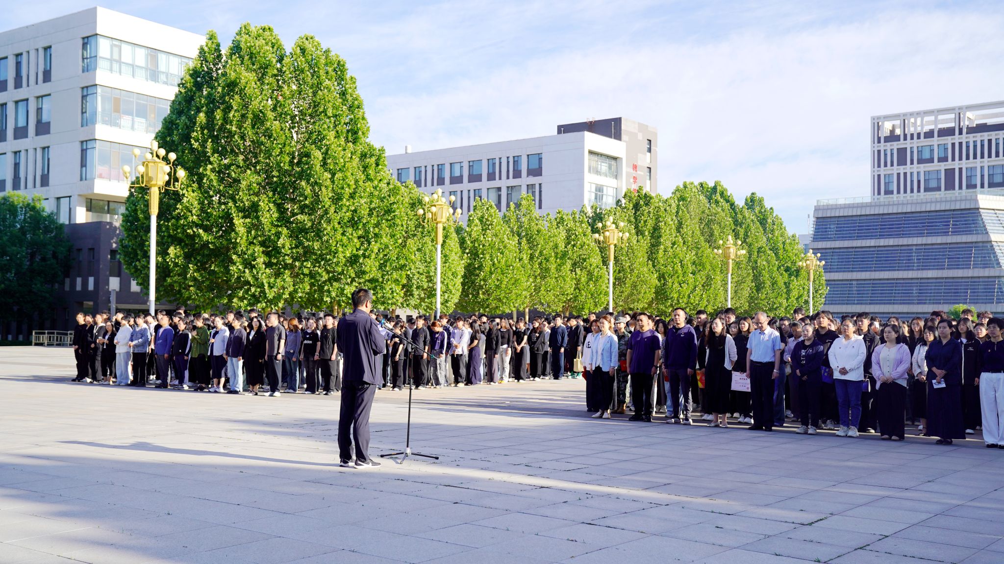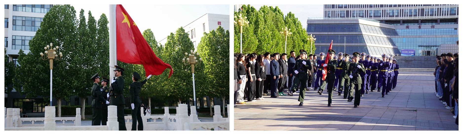 朝阳初升,国歌嘹亮。国旗护卫队踏着铿锵步伐,将鲜艳的五星红旗护送至旗台。全体师生肃立注目,齐声高唱,目送国旗在晨光中冉冉升起,迎风招展。随后,教师代表左熹、学生代表贾文圆深情寄语,结合专业特色,抒发爱国情怀,展现了昂扬的精神风貌。