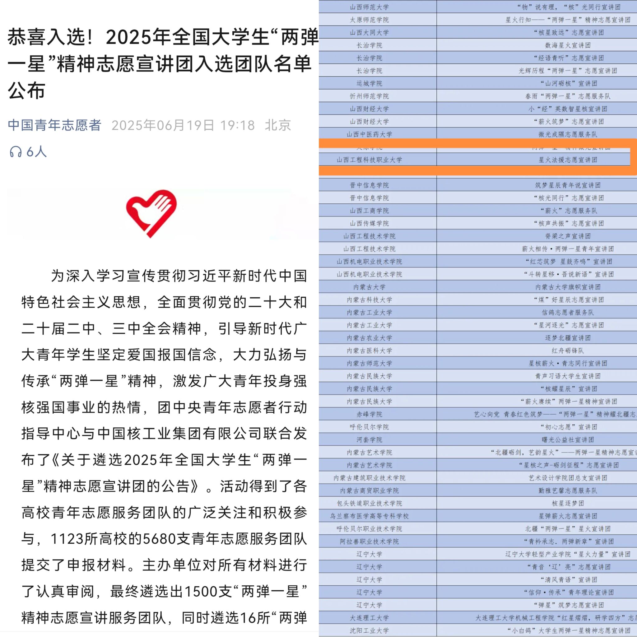 近日,由团中央青年志愿者行动指导中心与中国核工业集团有限公司联合举办的2025年全国大学生“两弹一星”精神志愿宣讲团遴选活动中传来喜讯,我院一支由10名学生组成的团队,在全国1123所高校的5680支团队中脱颖而出,成功入选1500支志愿宣讲团。