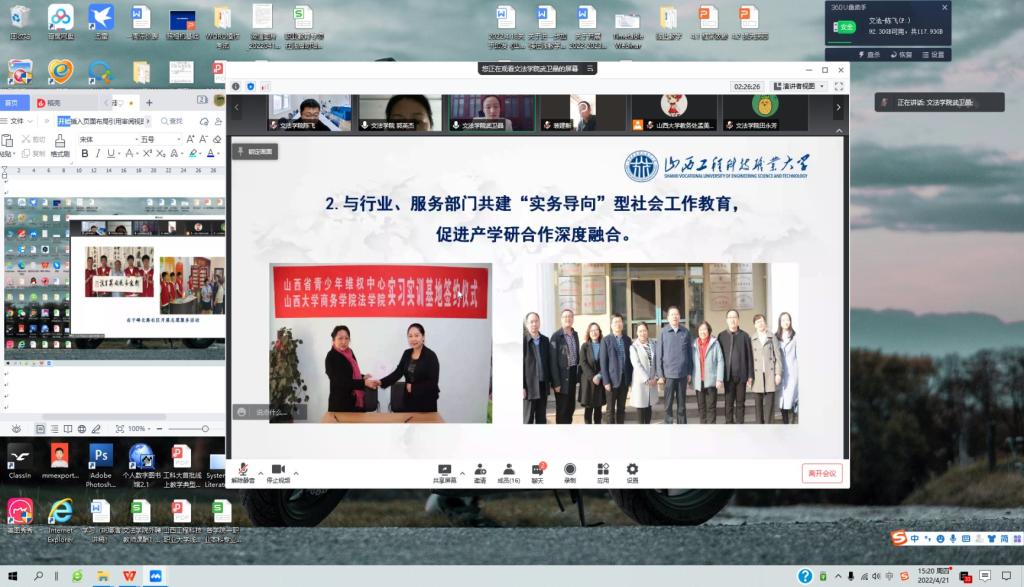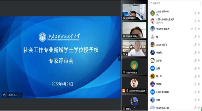 2022年4月21日下午,花蝴蝶高清免费看片大全在学校教务处的组织安排下,通过腾讯会议的形式召开了“社会工作专业新增学士学位授予权专家评审会”。评审会邀请了山西大学政治与公共管理学院副院长任晓春教授、刘梦岳副教授担任评审专家。山西省人民政府学位办主任李坤,山西大学教务处处长宋鹏等领导,以及山西工程科技职业大学副校长李锦元、教务部负责人裴建新、程选、鲁大伟,还有花蝴蝶高清免费看片大全教学、科研及社会工作专业负责人等参加了会议。会议由花蝴蝶高清免费看片大全行政第二负责人(主持工作)郭英杰副教授主持。